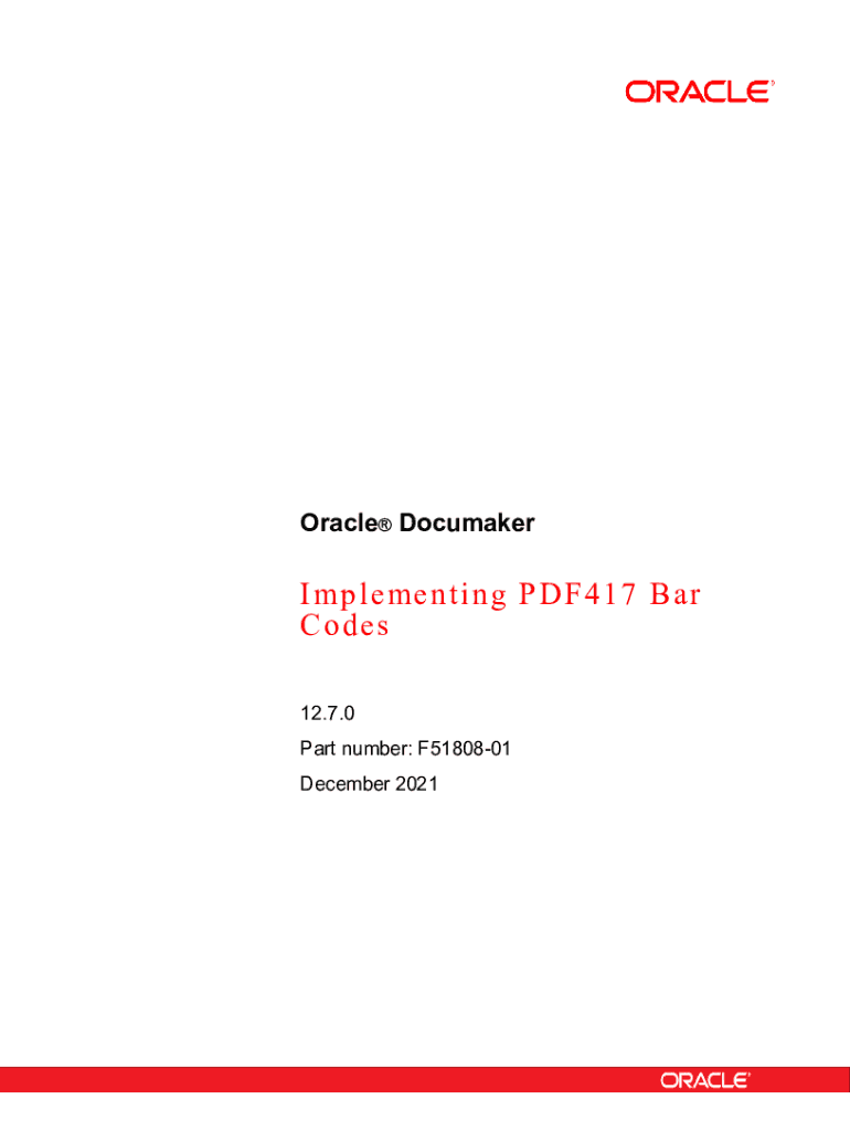 Start Oracle DocumakerImplementing PDF417 Bar Codes 12.7.0 Part number: F5180801 December 2021NoticeCopyright 2009, 2020, 2021 Oracle and/or its affiliates. All rights reserved. The Programs (which