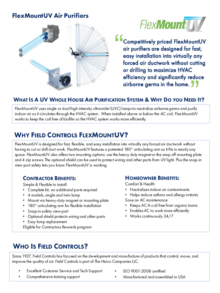 FlexMountUV Air PurifiersCompetitively priced FlexMountUV air purifiers are designed for fast, easy installation into virtually any forced air ductwork without cutting or drilling to maximize HVAC