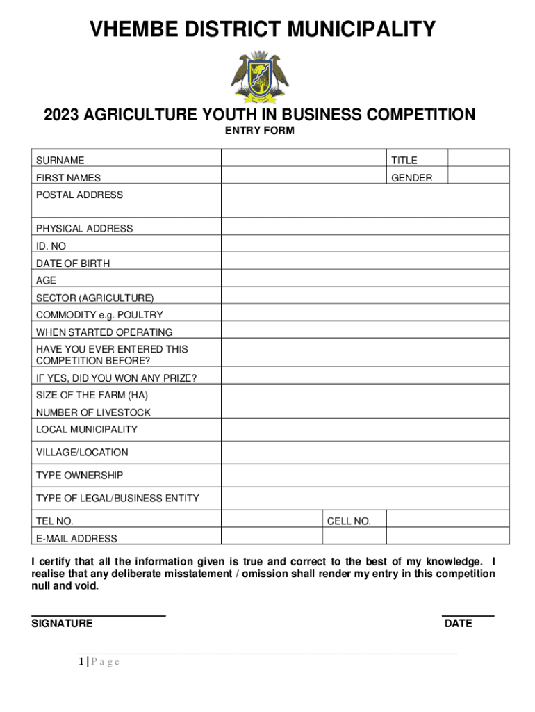 THEME DISTRICT MUNICIPALITY2023 AGRICULTURE YOUTH IN BUSINESS COMPETITION ENTRY FORM SURNAMETITLEFIRST NAMESGENDERPOSTAL ADDRESS PHYSICAL ADDRESS ID. NO DATE OF BIRTH AGE SECTOR (AGRICULTURE) COMMODITY