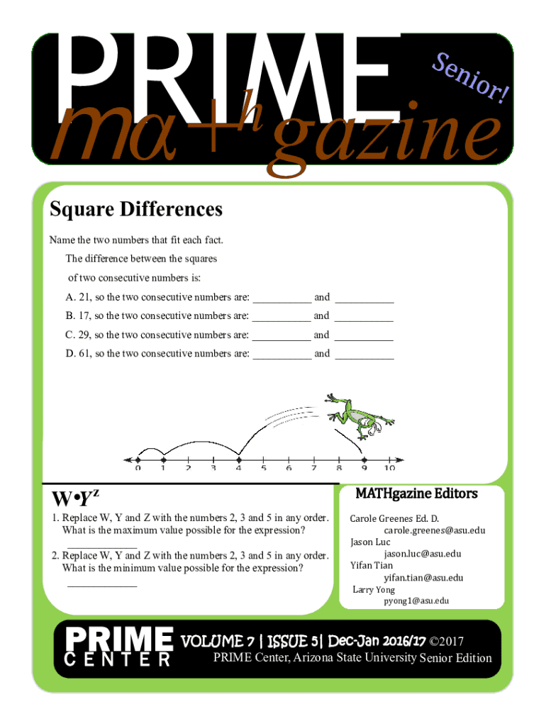 PRIME m+ gazing Square Differences Name the two numbers that fit each fact. The difference between the squares of two consecutive numbers is: A. 21, so the two consecutive numbers are: ___ and ___