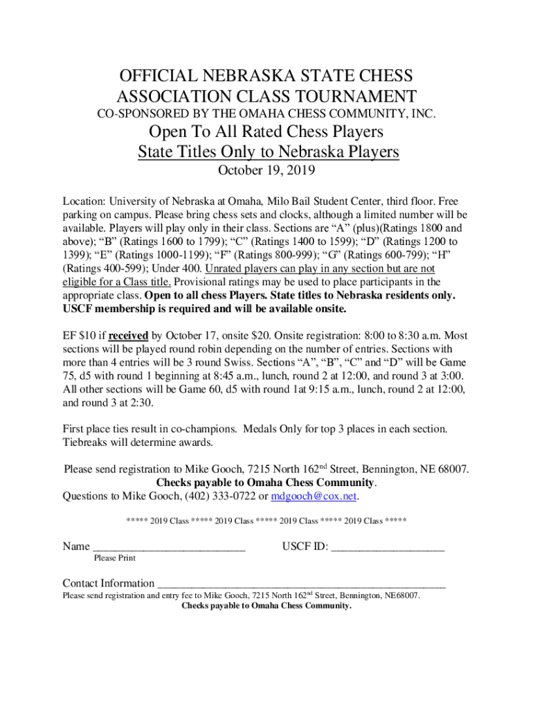 OFFICIAL NEBRASKA STATE CHESS ASSOCIATION CLASS TOURNAMENT COSPONSORED BY THE OMAHA CHESS COMMUNITY, INC. Open To All Rated Chess Players State Titles Only to Nebraska Players October 19, 2019, Location: