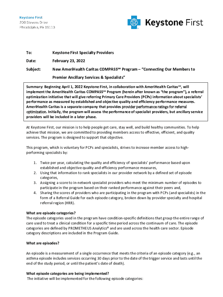 To:Keystone First Specialty ProvidersDate:February 23, 2022Subject:New AmeriHealth Capital COMPASS Program Connecting Our Members to