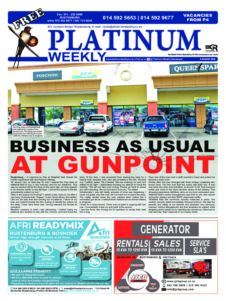 Fax: 011 252 6669 ROSENBERG a/hrs 072 482 6871 / 081 710 6540014 592 5653 | 014 592 9677VACANCIES FROM P4221 Joubert Street, Rosenberg, Email: news@platinumweekly.co.zaVerified Print Quantity 25 000