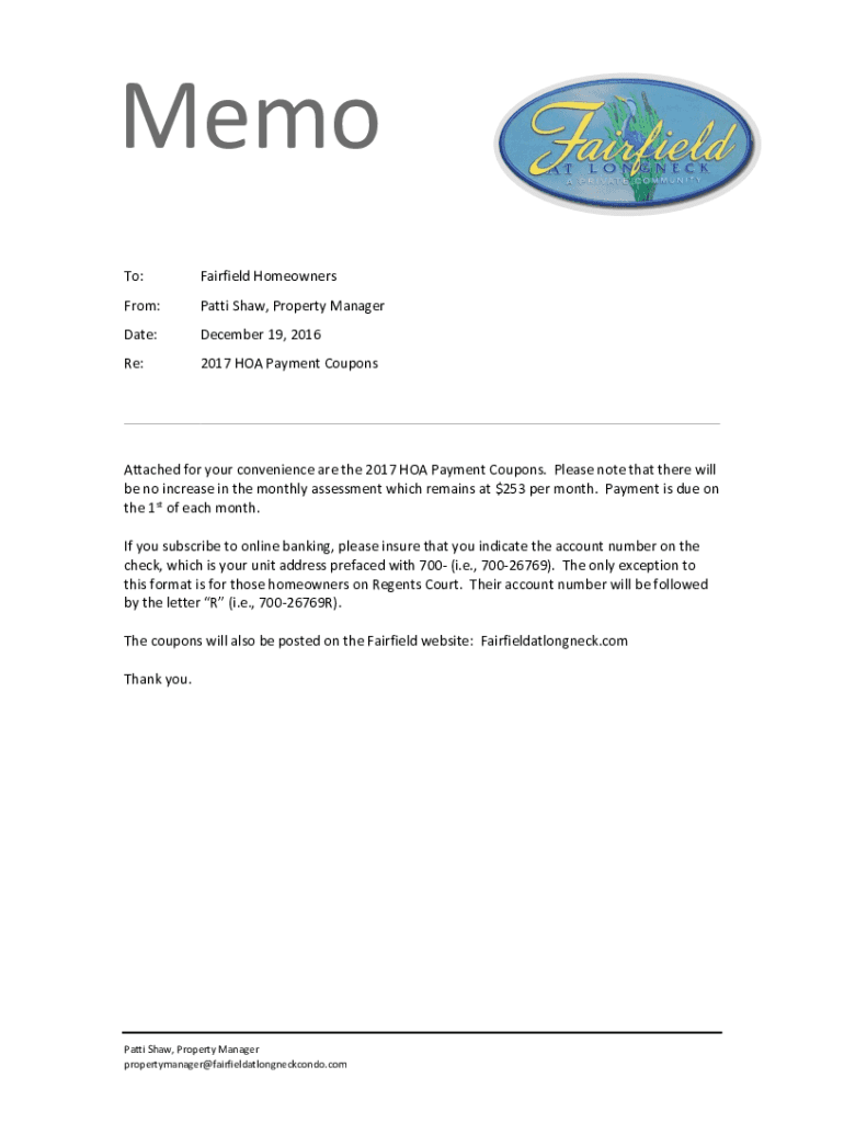 Memo To:Fairfield HomeownersFrom:Patti Shaw, Property Managerial:December 19, 2016Re:2017 HOA Payment CouponsAttached for your convenience are the 2017 HOA Payment Coupons. Please note that there