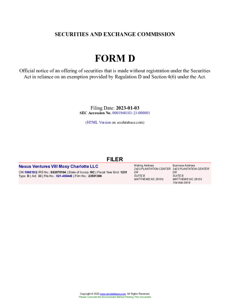 Get the free Nexus Ventures VIII Moxy Charlotte LLC Form D Filed 2023-01-03. Accession Number