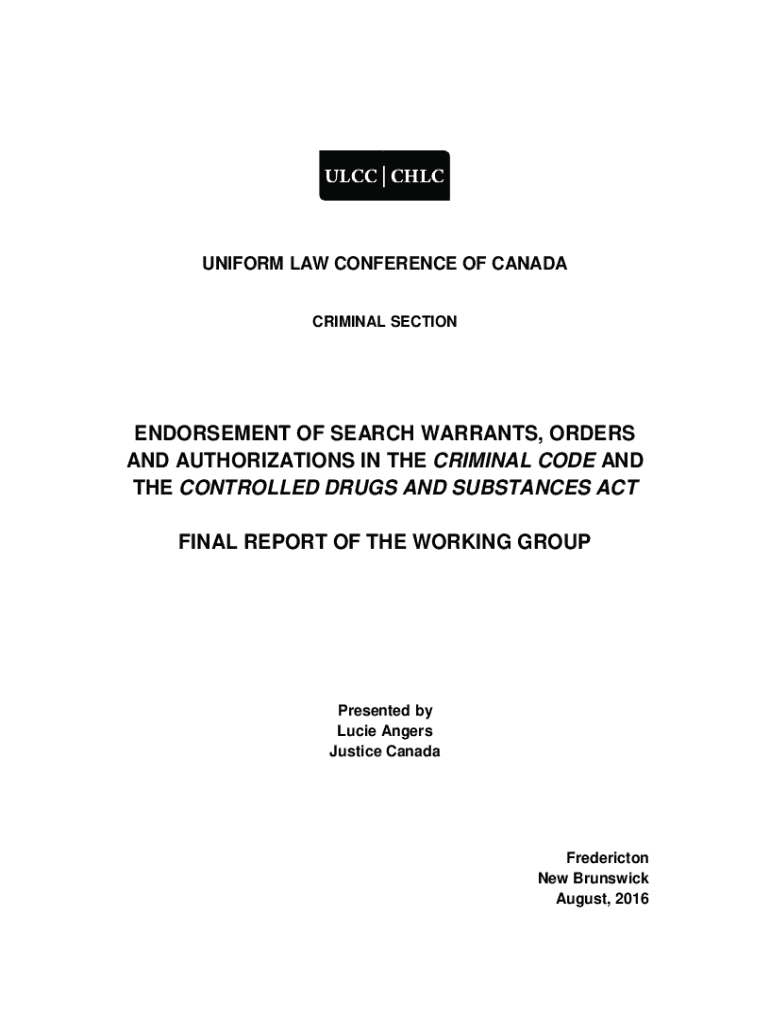 UNIFORM LAW CONFERENCE OF CANADA CRIMINAL SECTIONENDORSEMENT OF SEARCH WARRANTS, ORDERS AND AUTHORIZATIONS IN THE CRIMINAL CODE AND THE CONTROLLED DRUGS AND SUBSTANCES ACT FINAL REPORT OF THE WORKING
