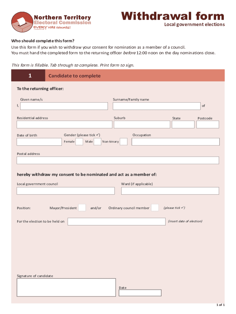 Withdrawal formal government elections should complete this form? Use this form if you wish to withdraw your consent for nomination as a member of a council. You must hand the completed form to the
