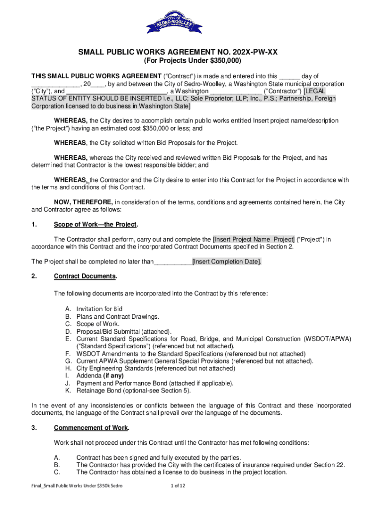 SMALL PUBLIC WORKS AGREEMENT NO. 202XPWXX