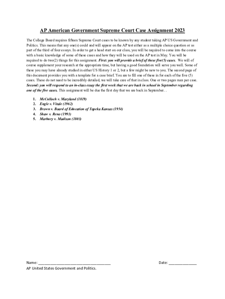 AP American Government Supreme Court Case Assignment 2023 The College Board requires fifteen Supreme Court cases to be known by any student taking AP US Government and Politics. This means that anyone(s)