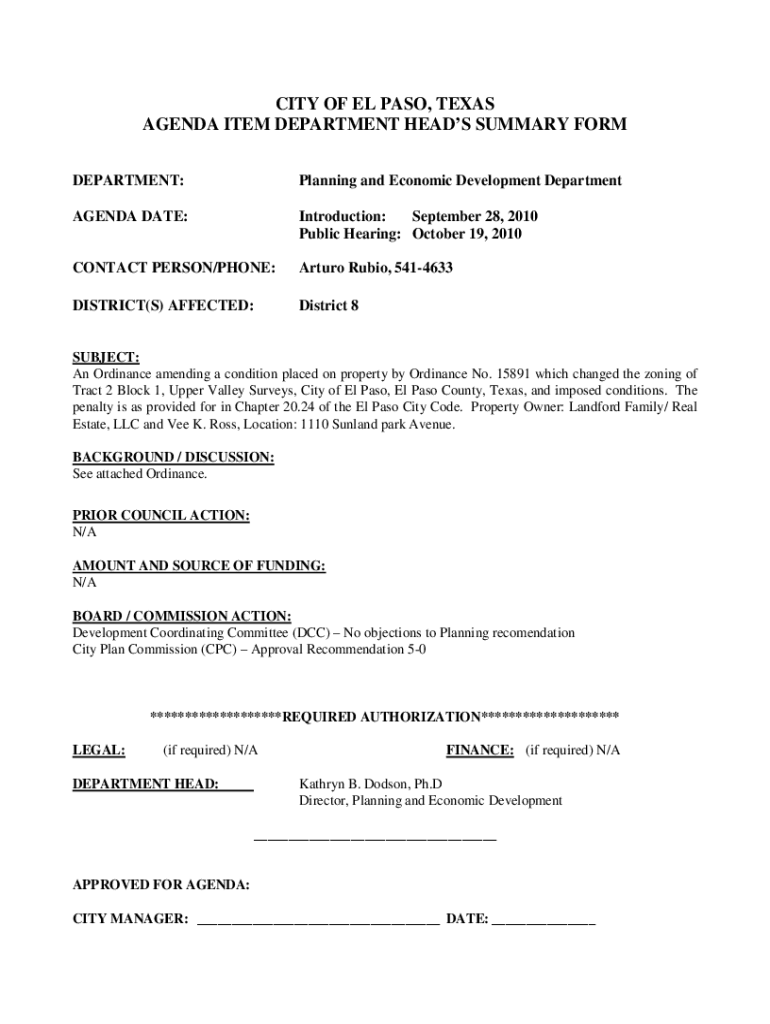 CITY OF EL PASO, TEXAS AGENDA ITEM DEPARTMENT HEADS SUMMARY FORM DEPARTMENT:Planning and Economic Development DepartmentAGENDA DATE:Introduction: September 28, 2010, Public Hearing: October 19, 2010CONTACT