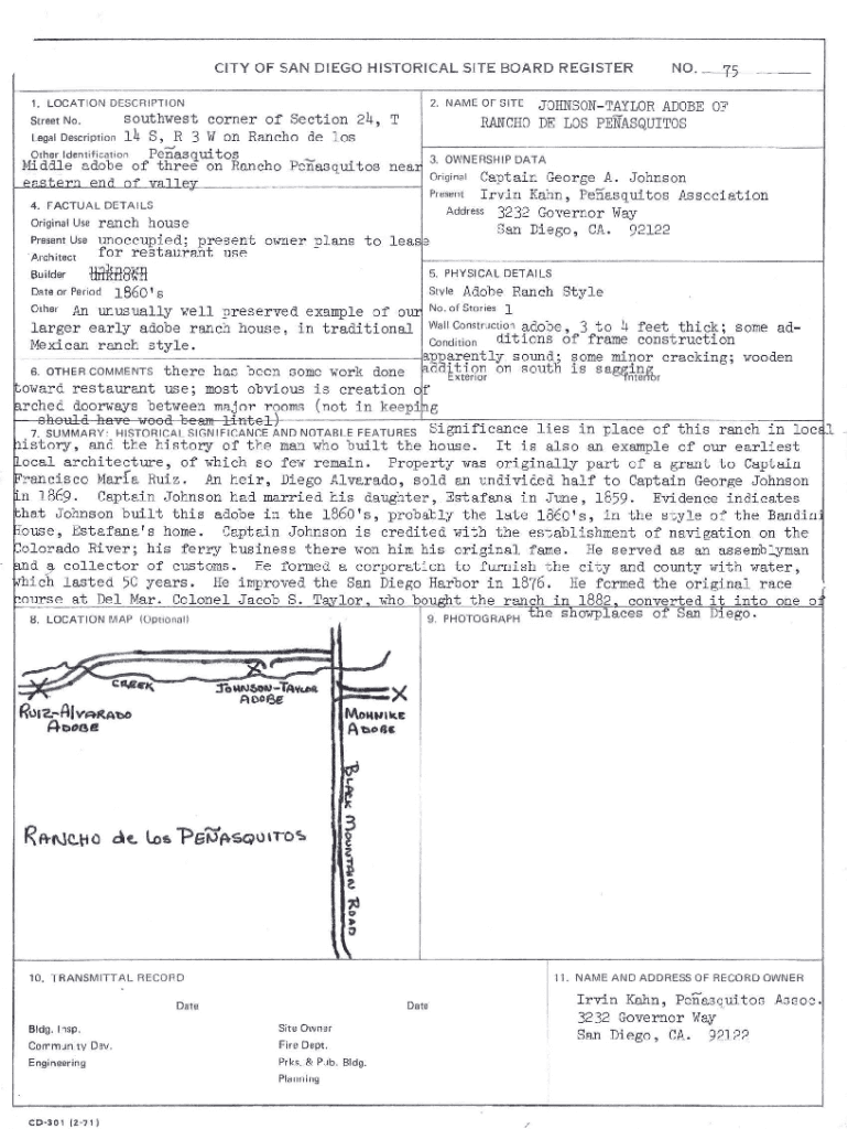 CITY OF SAN DIEGO HISTORICAL SITE BOARD REGISTER 1. LOCATION DESCRIPTION Street No. southwest corner of Section 2 4, T Legal Description 14 S, R 3 W on Rancho de los Other Identification Pegasus TOS