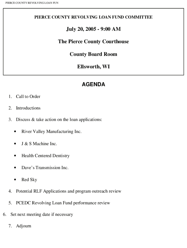 PIERCE COUNTY REVOLVING LOAN FIERCE COUNTY REVOLVING LOAN FUND COMMITTEE July 20, 2005 9:00 AM The Pierce County Courthouse County Board Room Ellsworth, WI AGENDA 1. Call to Order 2. Introductions