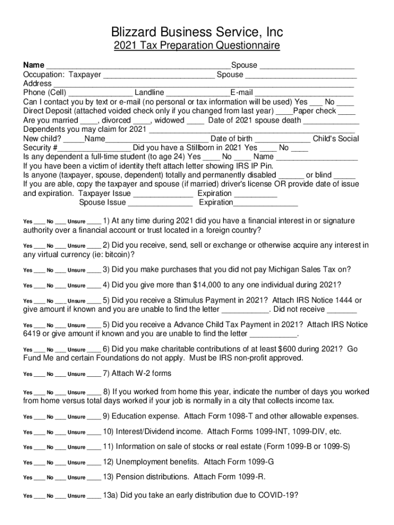 Blizzard Business Service, Inc 2021 Tax Preparation Questionnaire Name ___Spouse ___ Occupation: Taxpayer ___ Spouse ___ Address ___ Phone (Cell) ___ Landline ___Email ___ Can I contact you by text