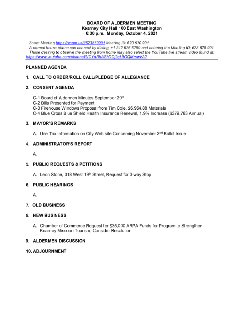 BOARD OF ALDERMEN MEETING Kearney City Hall 100 East Washington 6:30 p.m., Monday, October 4, 2021, Zoom Meeting https://zoom.us/j/623570901 Meeting ID: 623 570 901 A normal house phone can connect