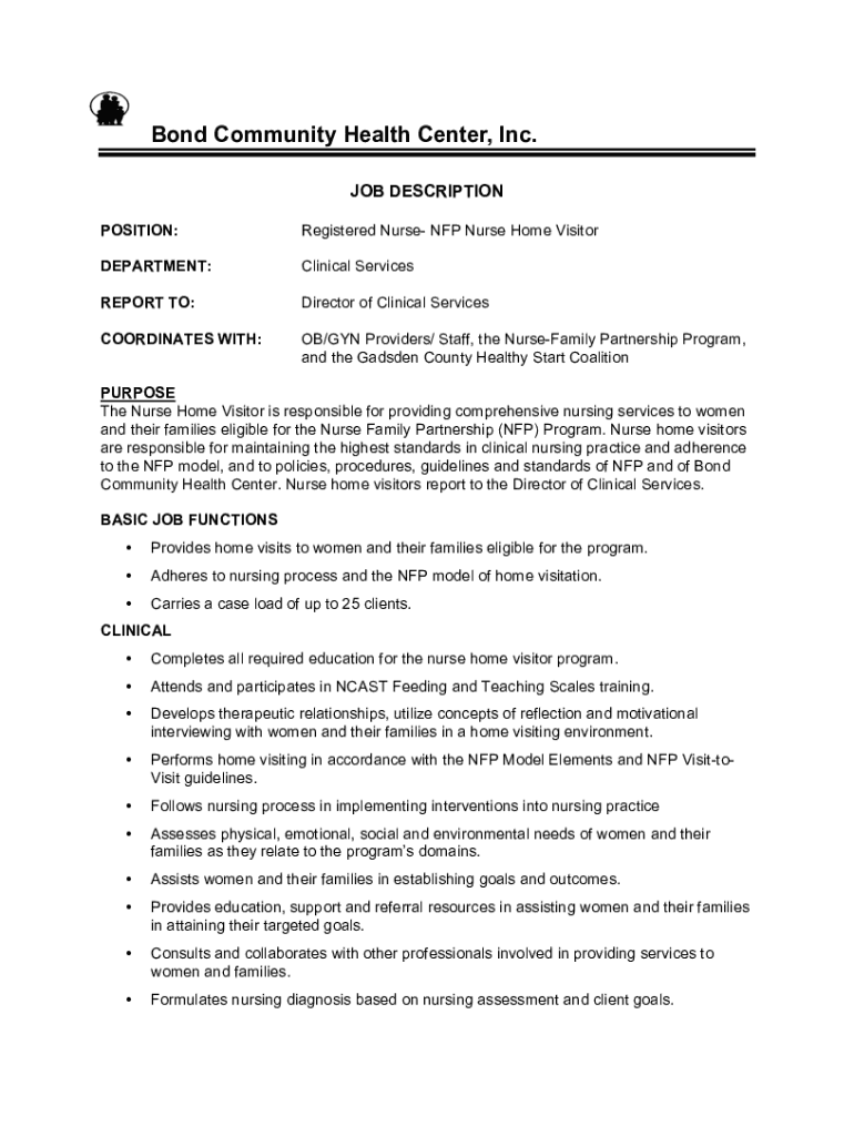 Bond Community Health Center, Inc. JOB DESCRIPTION POSITION:Registered Nurse NFL Nurse Home VisitorDEPARTMENT:Clinical ServicesREPORT TO:Director of Clinical ServicesCOORDINATES WITH:OB/GUN Providers/