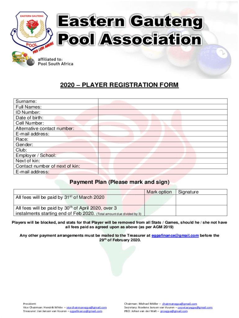 2020 PLAYER REGISTRATION FORM Surname: Full Names: ID Number: Date of birth: Cell Number: Alternative contact number: Email address: Race: Gender: Club: Employer / School: Next of kin: Contact number