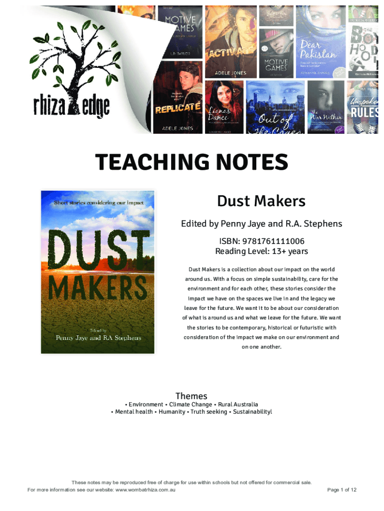 TEACHING NOTES Dust Makers Edited by Penny Jane and R.A. Stephens ISBN: 9781761111006 Reading Level: 13+ years Dust Makers is a collection about our impact on the world around us. With a focus on
