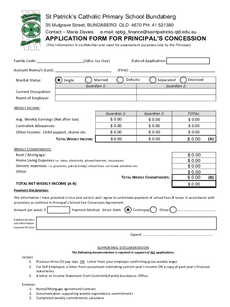 St Patrick's Catholic Primary School Bundaberg 35 Musgrove Street, BUNDABERG QLD 4670 PH: 41 521380 Contact Maria Davies email: spbg_finance@saintpatricks.qld.edu.auAPPLICATION FORM FOR PRINCIPALS