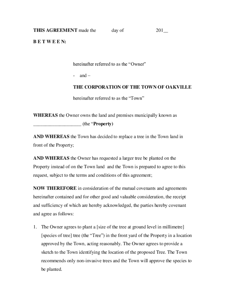 THIS AGREEMENT made the day of201__B E T W E E N:hereinafter referred to as the Owner and THE CORPORATION OF THE TOWN OF OAKVILLE hereinafter referred to as the TownWHEREAS the Owner owns the land