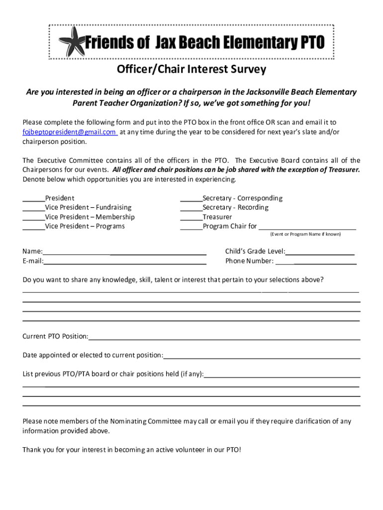 Officer/Chair Interest Survey Are you interested in being an officer or a chairperson in the Jacksonville Beach Elementary Parent Teacher Organization? If so, we've got something for you! Please complete