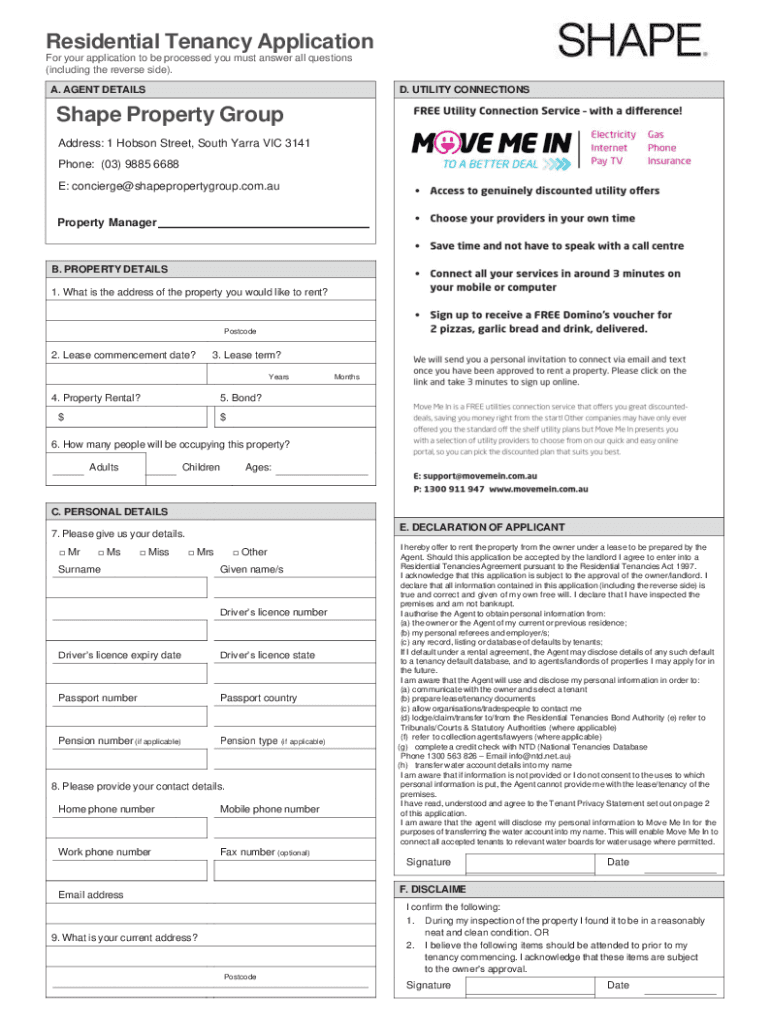 Residential Tenancy Application For your application to be processed you must answer all questions (including the reverse side). A. AGENT DETAILS. UTILITY CONNECTIONSShape Property Group Address: