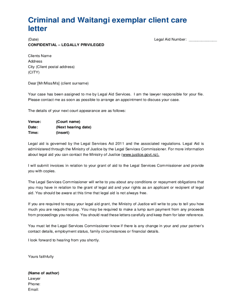 Criminal and Waiting exemplar client care letter (Date)Legal Aid Number: ___CONFIDENTIAL LEGALLY PRIVILEGED Clients Name Address City (Client postal address) (CITY) Dear [Mr/Miss/Ms] (client surname)