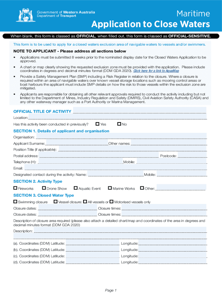 MaritimeGovernment of Western Australia Department of TransportApplication to Close Watershed blank, this form is classed as OFFICIAL, when filled out, this form is classed as OFFICIALSENSITIVE. This