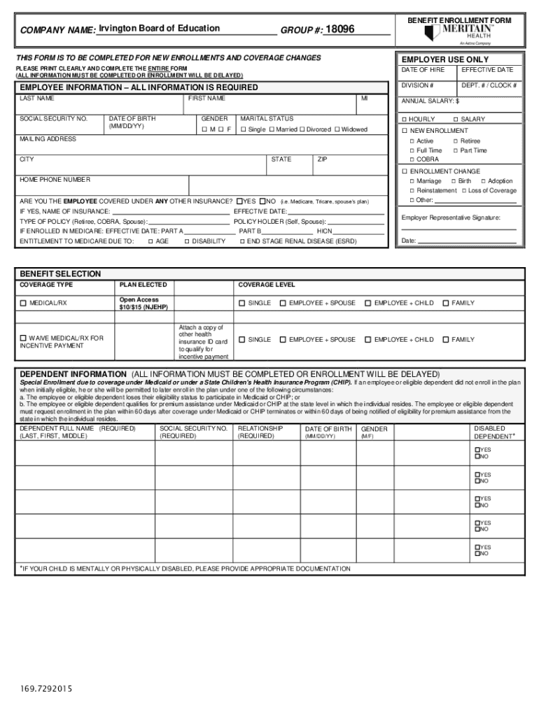 BENEFIT ENROLLMENT FORMCOMPANY NAME: Irvington Board of EducationGROUP #:18096THIS FORM IS TO BE COMPLETED FOR NEW ENROLLMENTS AND COVERAGE CHANGESEMPLOYER USE ONLYPLEASE PRINT CLEARLY AND COMPLETE