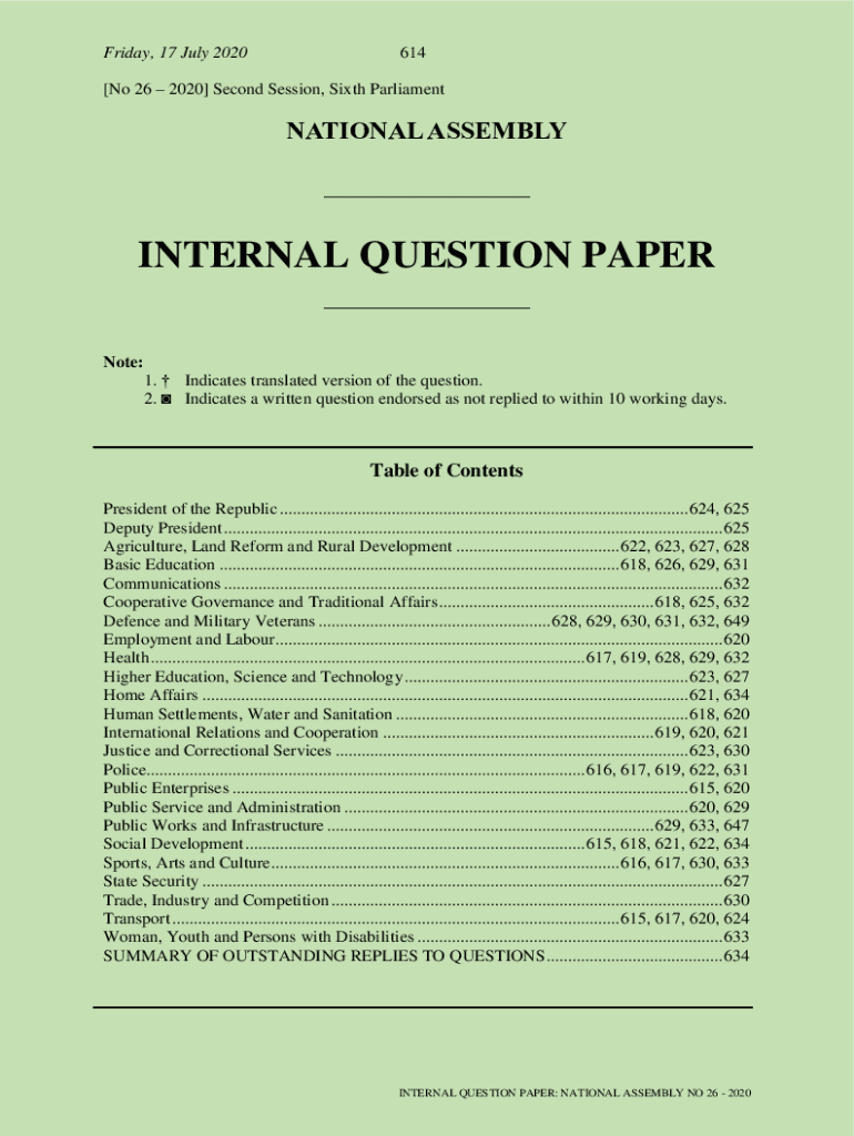 Friday, 17 July 2020614[No 26 2020] Second Session, Sixth ParliamentNATIONAL ASSEMBLY ___INTERNAL QUESTION PAPER ___Note: 1. Indicates translated version of the question. 2. Indicates a written question