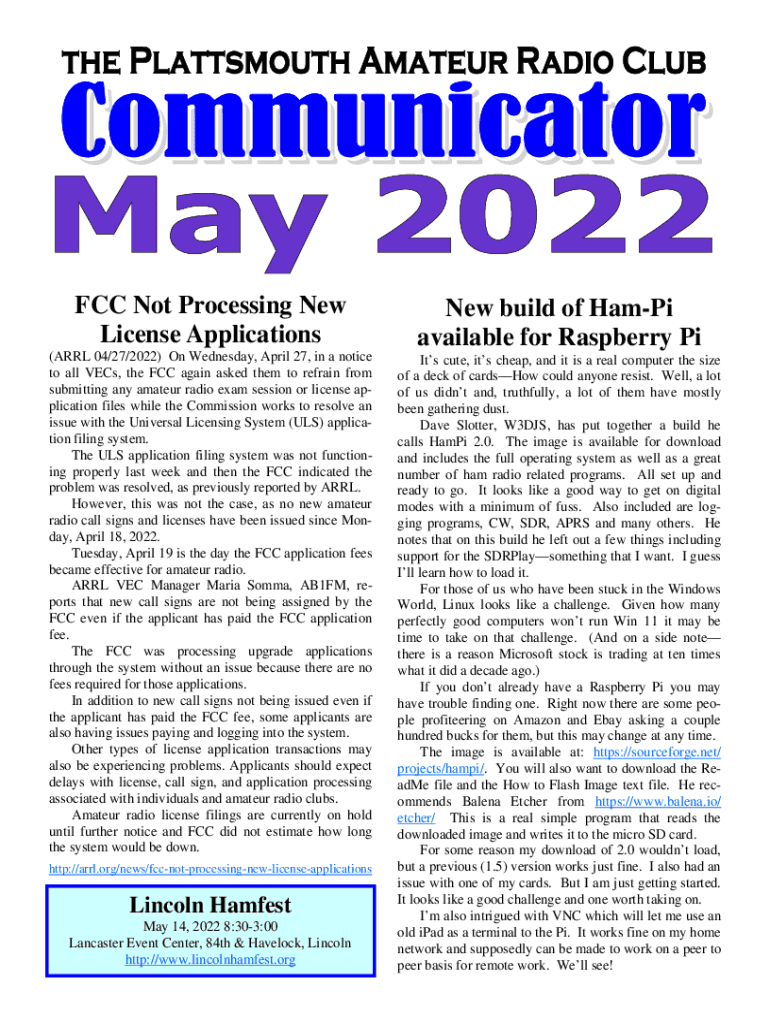 FCC Not Processing New License Applications build of Camp available for Raspberry Pi(ARL 04/27/2022) On Wednesday, April 27, in a notice to all Vets, the FCC again asked them to refrain from submitting