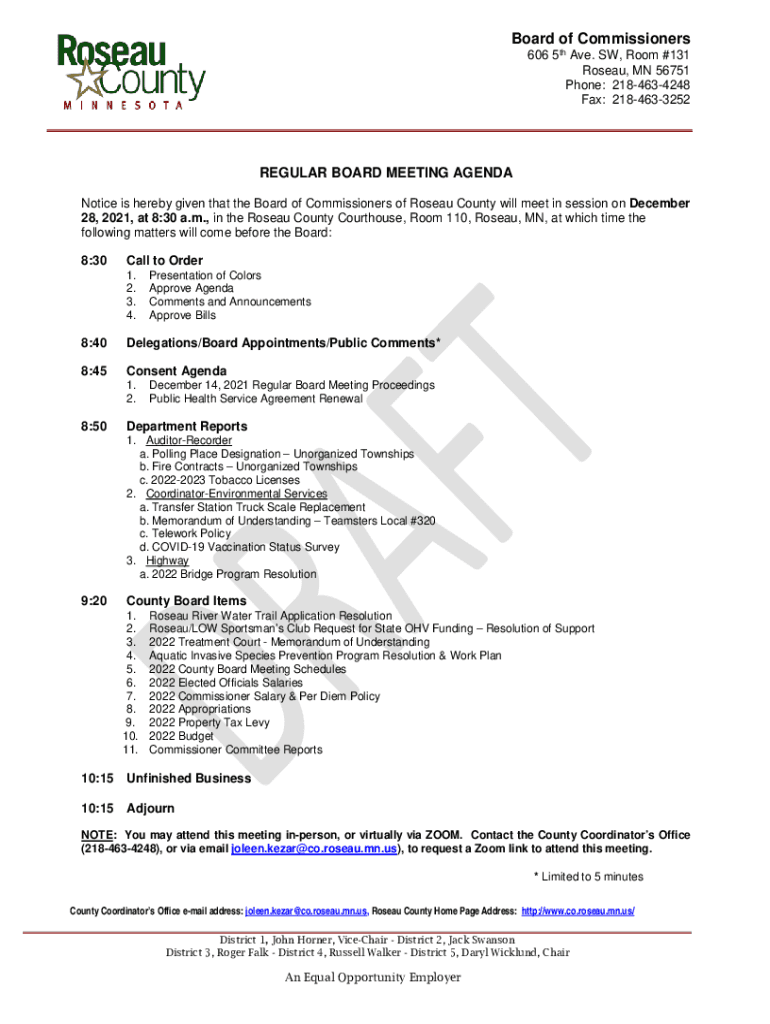 Board of Commissioners 606 5th Ave. SW, Room #131 Roseau, MN 56751 Phone: 2184634248 Fax: 2184633252REGULAR BOARD MEETING AGENDA Notice is hereby given that the Board of Commissioners of Roseau County