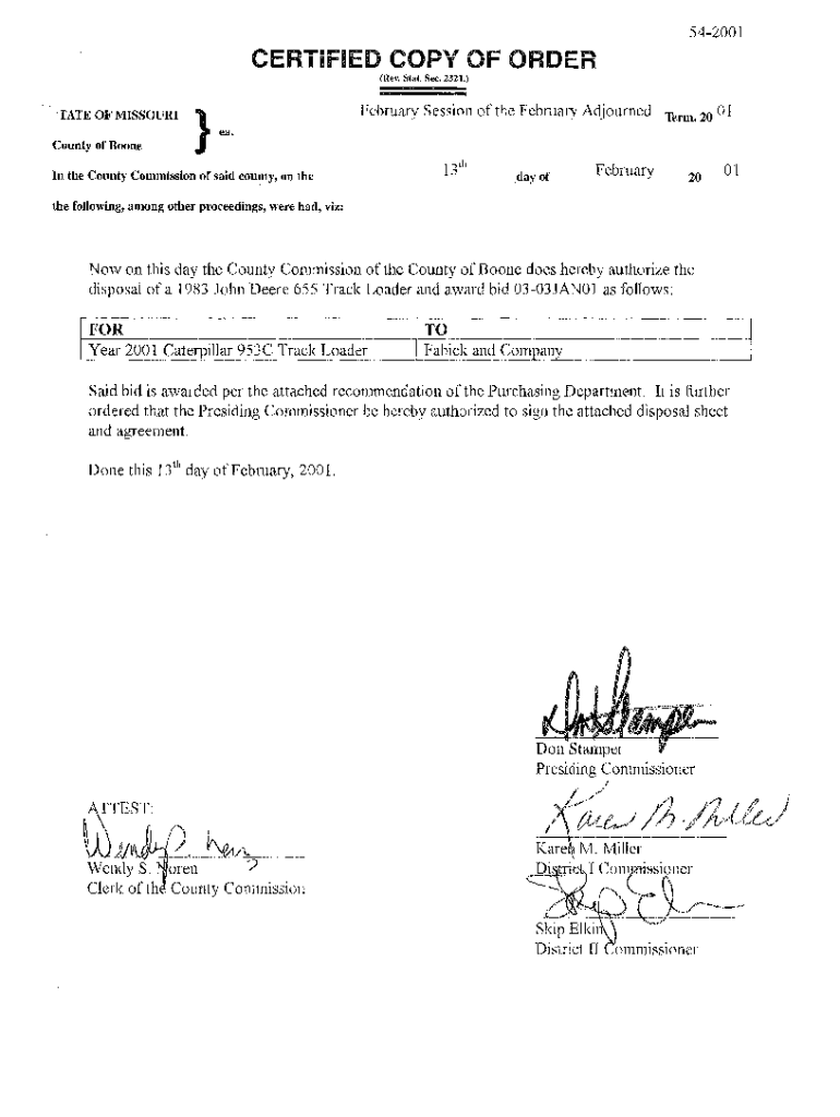 542001CERTIFIED COPY OF ORDER (Rev. Stat. Sec. 2321.)TATE OF MISSOURIFebruary Session of the February AdjournedTerm. 2001ea. County of Boone In the County Commission of said county, on the day ofFebruary20Olthe
