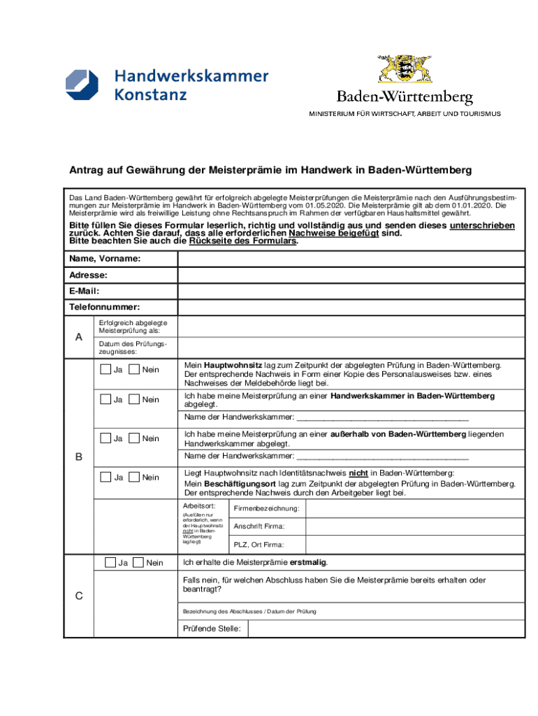Holen Sie sich kostenlos Antrag auf Gewhrung der Meisterprmie im Handwerk in ...