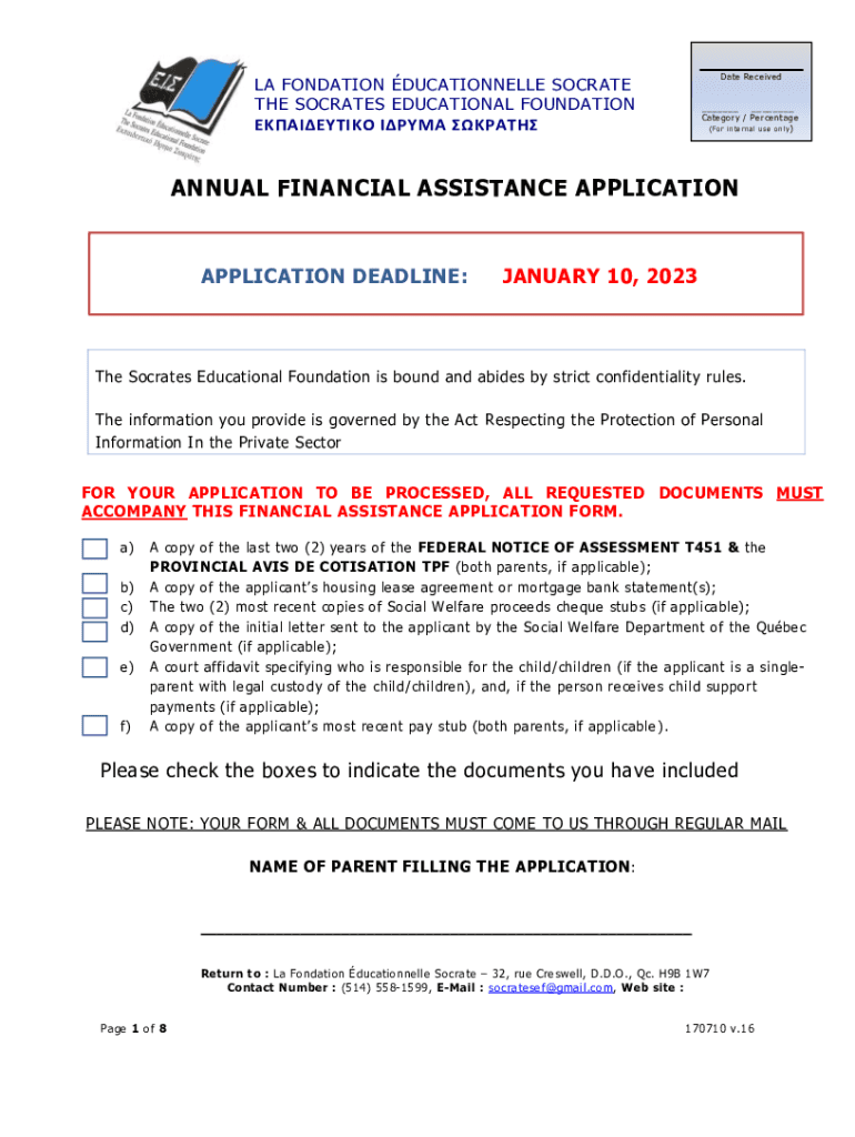 Date Received LA FOUNDATION DUCATIONNELLE SOCRATES THE SOCRATES EDUCATIONAL FOUNDATION I ___ ___ Category / Percent age (For internal us e o NL y)ANNUAL FINANCIAL ASSISTANCE APPLICATIONAPPLICATION