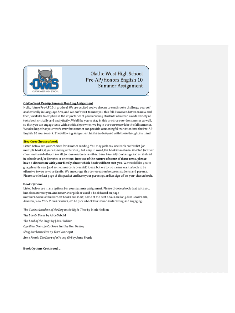 Summer AssignmentOlathe West Prep Summer Reading AssignmentHello, future Prep 10th graders! We are excited you've chosen to continue to challenge yourself