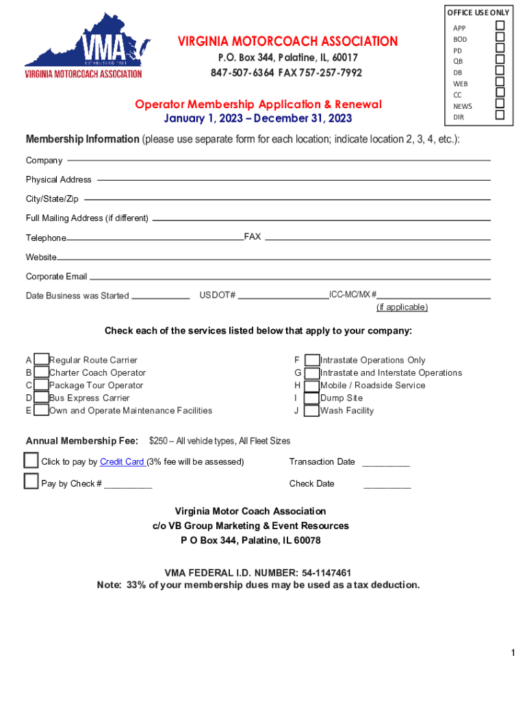 OFFICE USE ONLYVIRGINIA MOTORCADE ASSOCIATION P.O. Box 344, Palatine, IL, 60017 8475076364 FAX 7572577992Operator Membership Application & Renewal January 1, 2023, December 31, 2023APP BOD PD QB DB