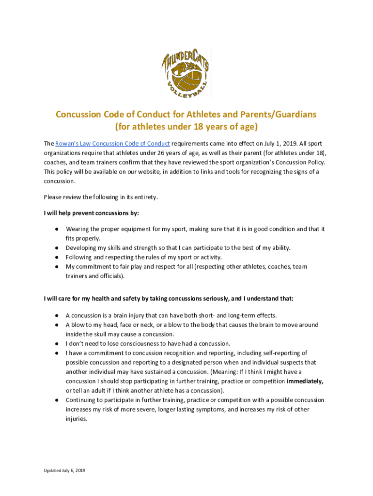 Concussion Code of Conduct for Athletes and Parents/Guardians (for athletes under 18 years of age) The Rowans Law Concussion Code of Conduct requirements came into effect on July 1, 2019. All sport