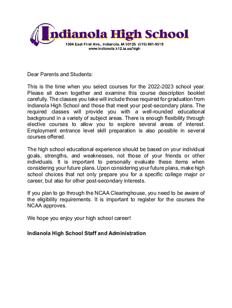 Dear Parents and Students: This is the time when you select courses for the 20222023 school year. Please sit down together and examine this course description booklet carefully. The classes you take