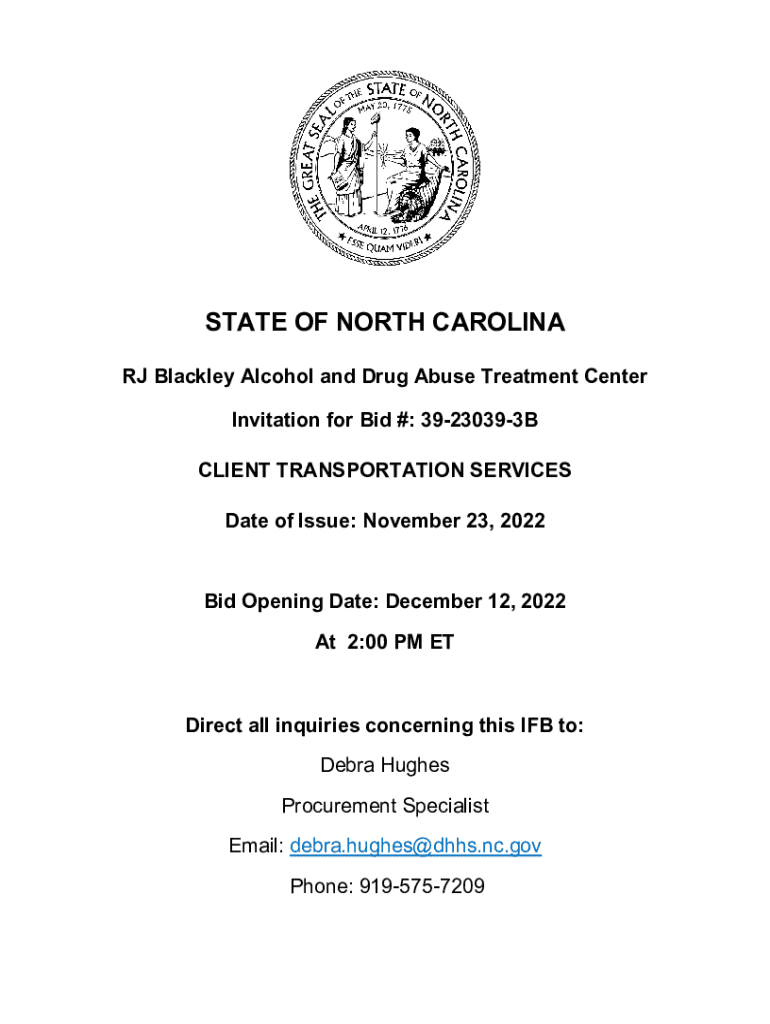 STATE OF NORTH CAROLINA RJ Blackly Alcohol and Drug Abuse Treatment Center Invitation for Bid #: 39230393B CLIENT TRANSPORTATION SERVICES Date of Issue: November 23, 2022, Bid Opening Date: December