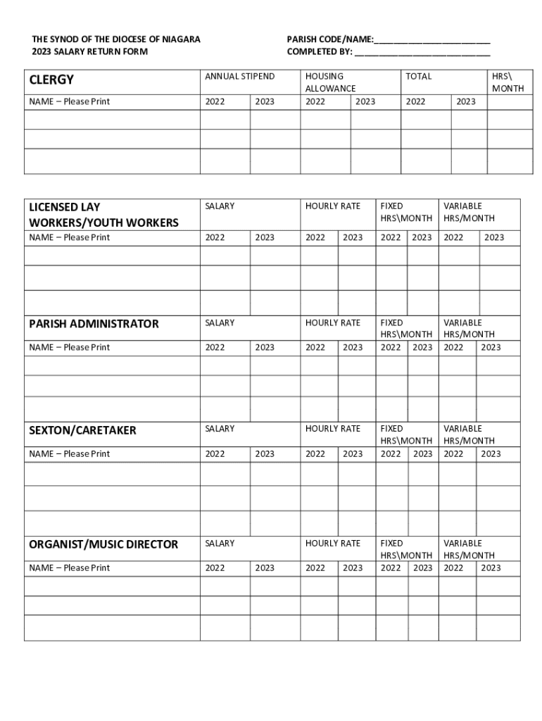 THE SYNOD OF THE DIOCESE OF NIAGARA 2023 SALARY RETURN FORMALISM CODE/NAME:___ COMPLETED BY: ___CLERGYANNUAL STIPENDIARY Please Print2022LICENSED LAY WORKERS/YOUTH WORKERSSALARYNAME Please Print2022PARISH