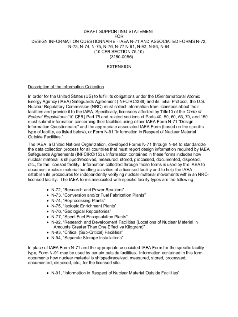 DRAFT SUPPORTING STATEMENT FOR DESIGN INFORMATION QUESTIONNAIRE IDEA N71 AND ASSOCIATED FORMS N72, N73, N74, N75, N76, N77 N91, N92, N93, N94 (10 CFR SECTION 75.10) (31500056) EXTENSIONDescription