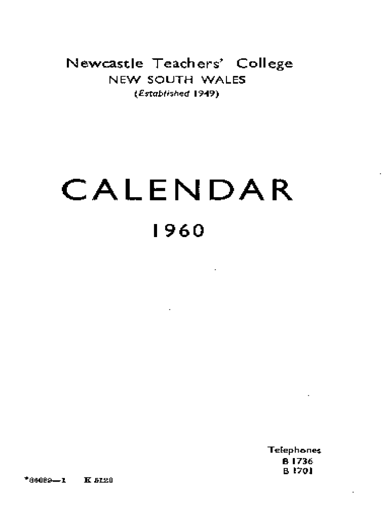 Newcastle Teachers\' College NEW SOUTH WALES (Established 1949)CALENDAR 1960Telephones B 1736 B 1701 ×866891K 6126CONTENTS Page Calendar for 1960 Teaching Staff and College Officers PART I. GENERAL