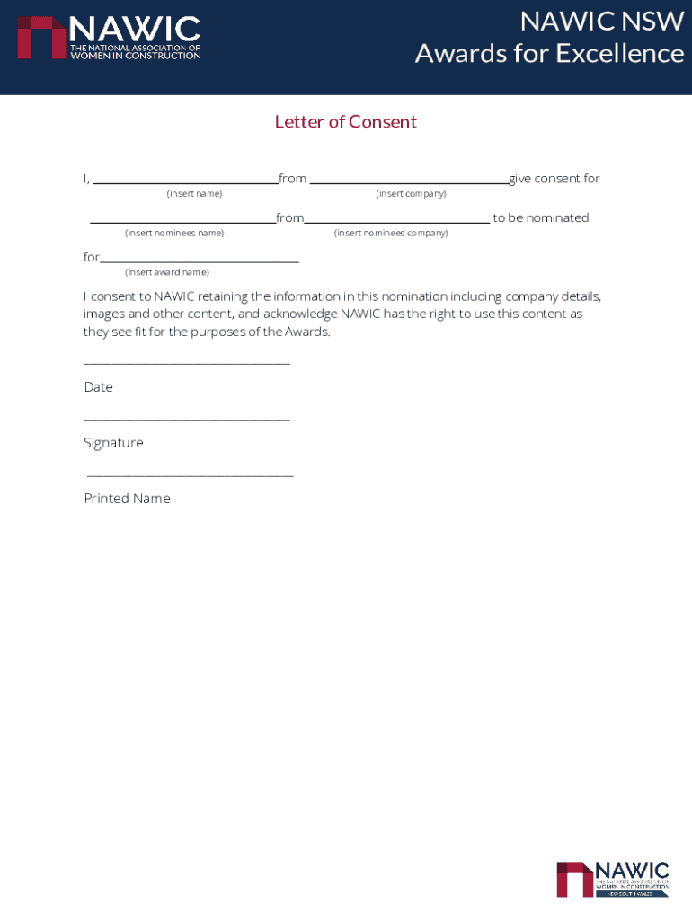 NARIC NSW Awards for Excellence Letter of Consent I, from (insert name)give consent for (insert company)from (insert nominees name)photo be nominated (insert nominees company). (insert award name)I