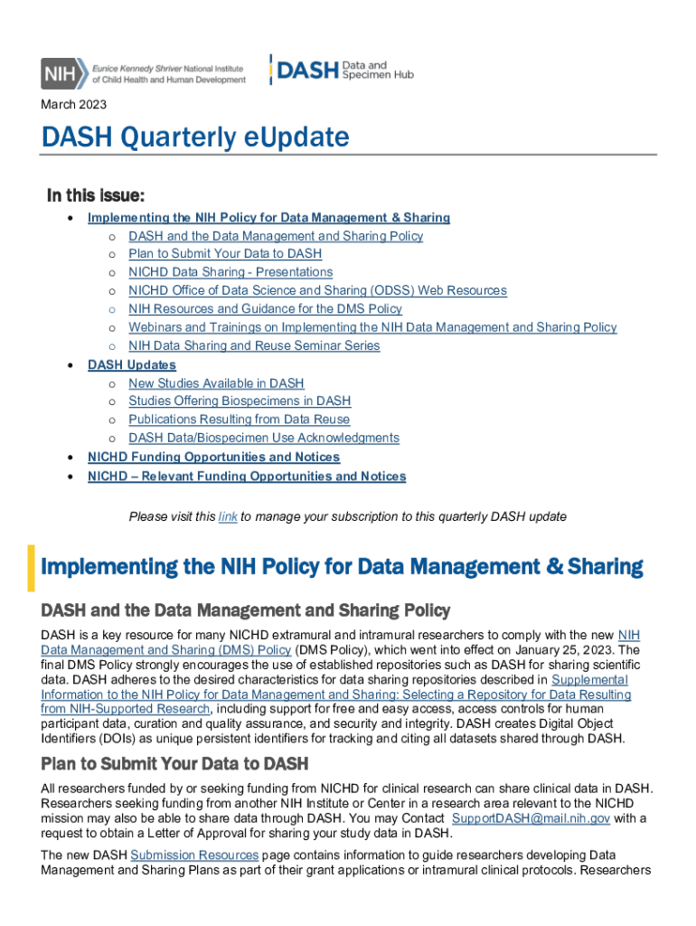 March 2023DASH Quarterly update In this issue: Implementing the NIH Policy for Data Management & Sharing o DASH and the Data Management and Sharing Policy o Plan to Submit Your Data to DASH o NICHE