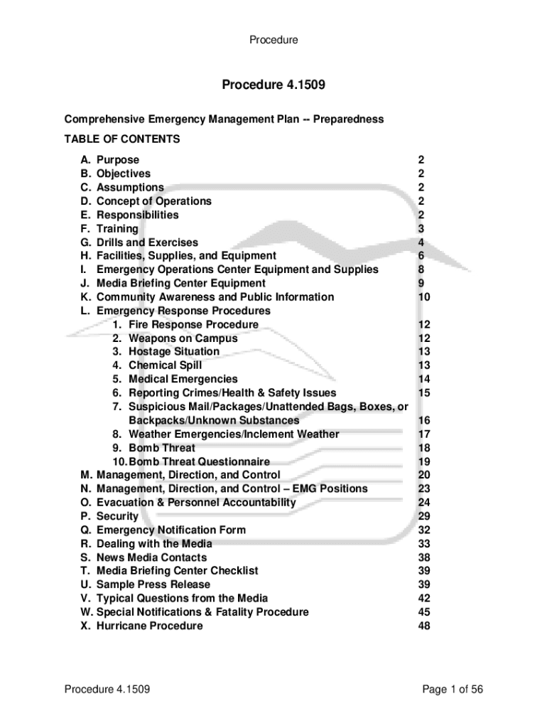 ProcedureProcedure 4.1509 Comprehensive Emergency Management Plan Preparedness TABLE OF CONTENTS A. B. C. D. E. F. G. H. I. J. K. L. Purpose Objectives Assumptions Concept of Operations Responsibilities