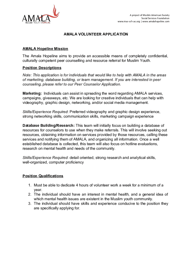 AprojectofMuslimAmericanSociety SocialServicesFoundation www.masssfsac.org|www.amalahopeline.com AMALAVOLUNTEERAPPLICATION AMALAHopelineMission The Amalia Hope line aims to provide an accessible means