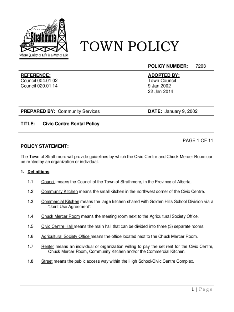 TOWN POLICY NUMBER:7203REFERENCE: Council 004.01.02 Council 020.01.14ADOPTED BY: Town Council 9 Jan 2002 22 Jan 2014PREPARED BY: Community ServicesDATE: January 9, 2002TITLE:Civic Center Rental Policymaker