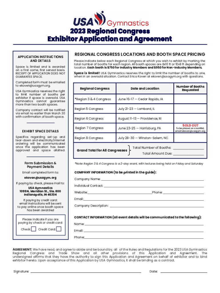 2023 Regional Congress Exhibitor Application and Agreement APPLICATION INSTRUCTIONS AND DETAILS Space is limited and is awarded on a first come, first served basis. RECEIPT OF APPLICATION DOES NOT