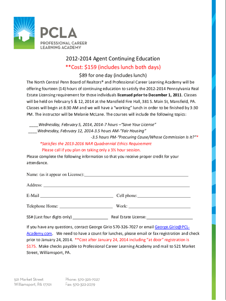20122014 Agent Continuing Education **Cost: $159 (includes lunch both days) $89 for one day (includes lunch) The North Central Penn Board of Realtors and Professional Career Learning Academy will