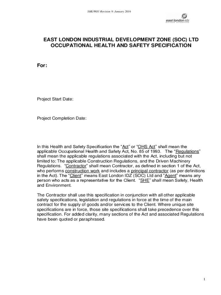 SHE/WI/1 Revision 9: January 2016EAST LONDON INDUSTRIAL DEVELOPMENT ZONE (SOC) LTD OCCUPATIONAL HEALTH AND SAFETY Specification:Project Start Date:Project Completion Date:In this Health and Safety